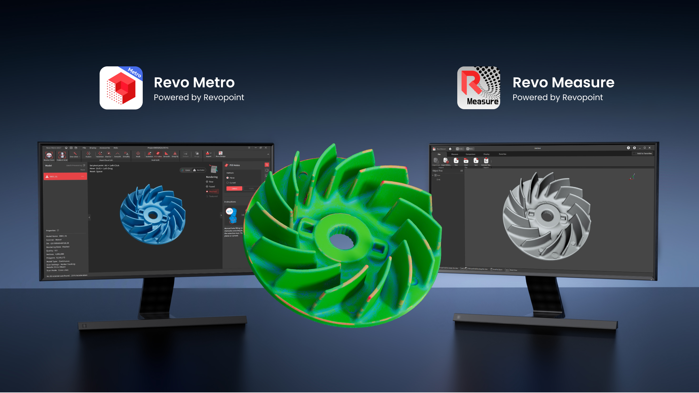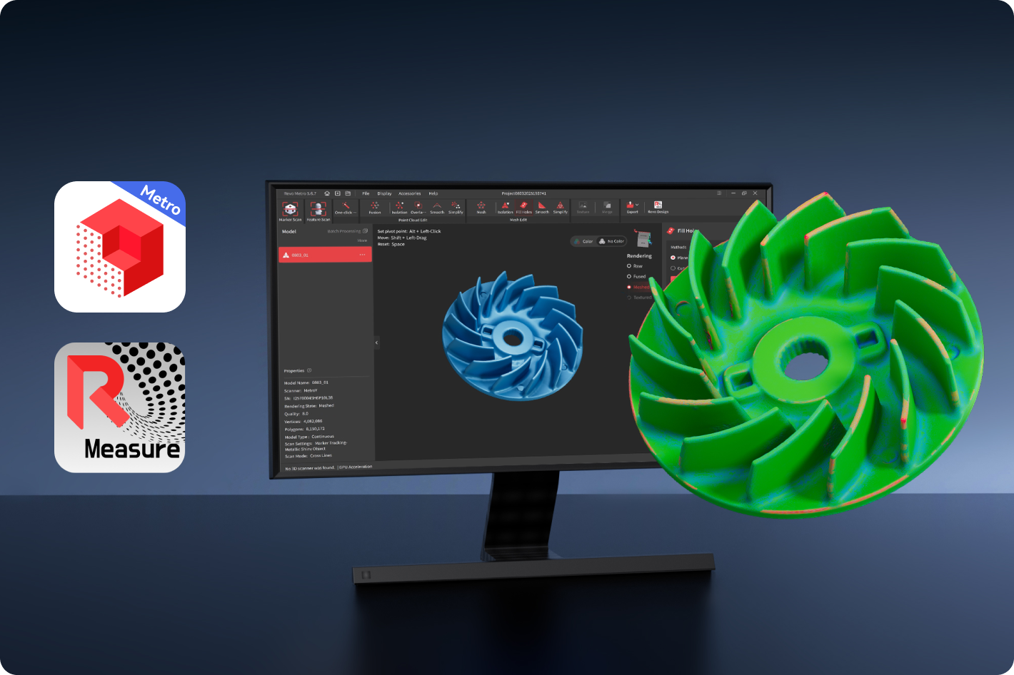 2軸ターンテーブル、Revoソフトウェア、MetroXシリーズが連携。ワンクリックで、色情報も完璧な自動フルカラースキャンを実現。