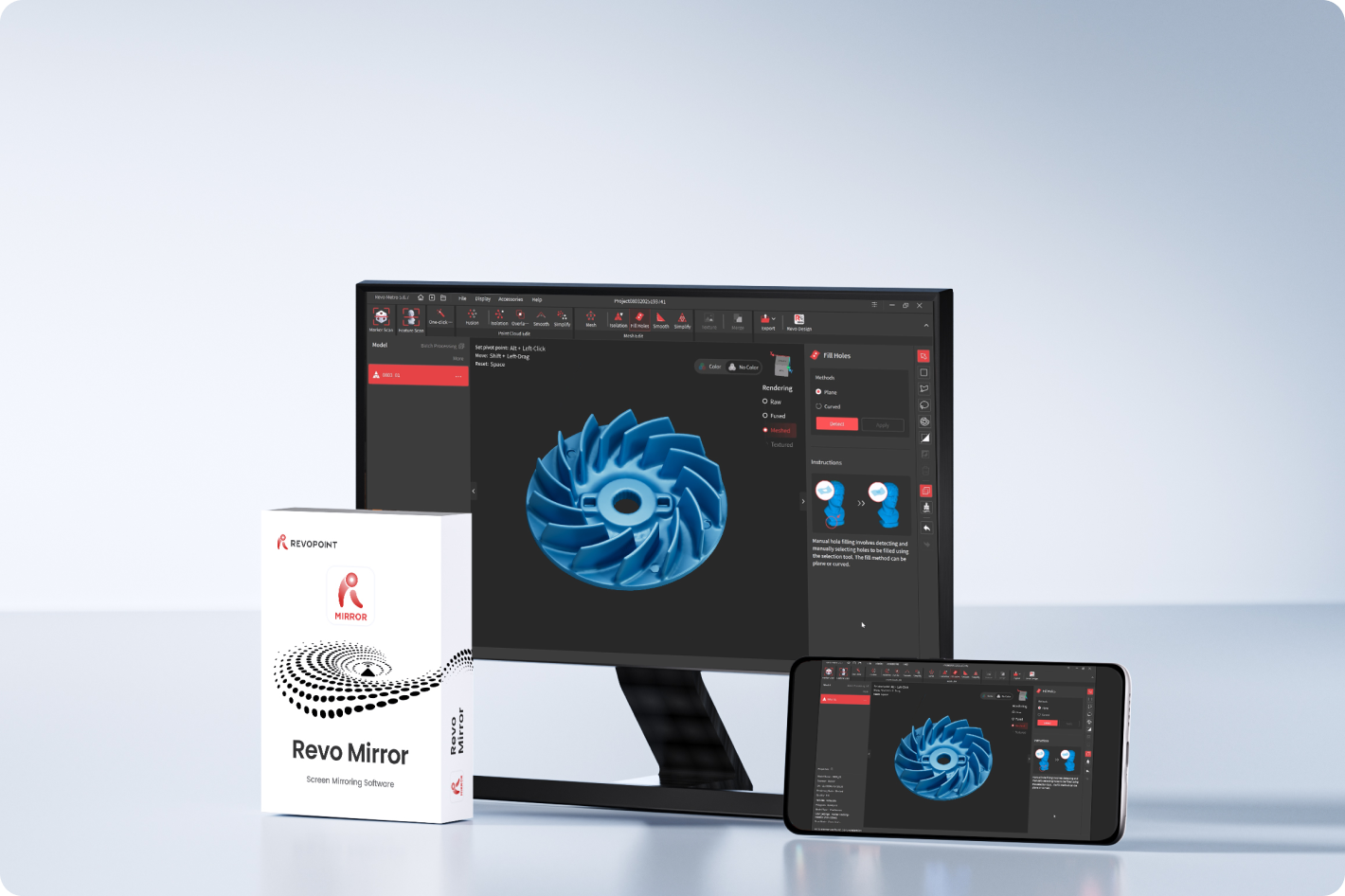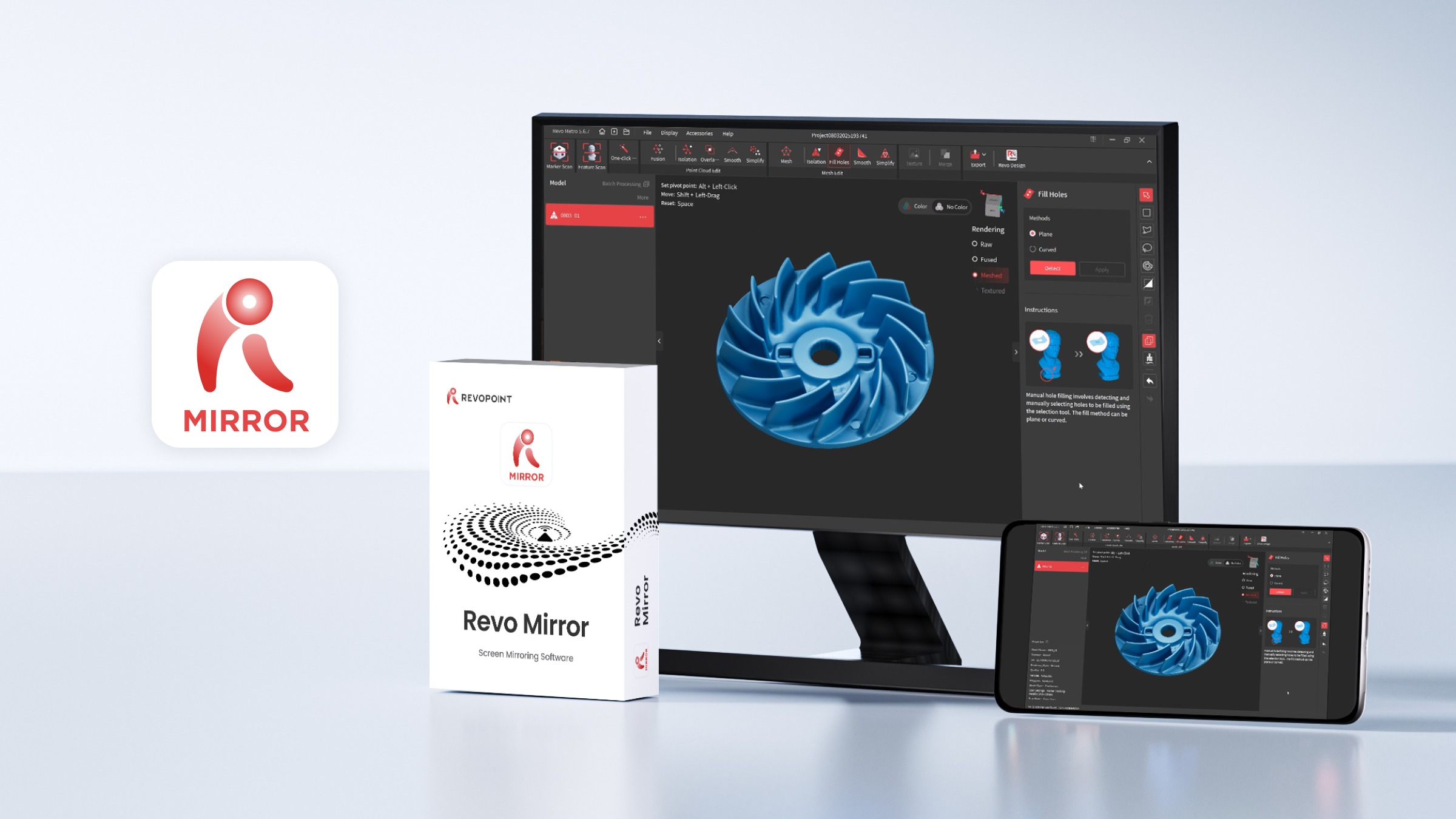 Revo Mirrorアプリで、PCからスマホ・タブレット・ディスプレイへスキャンをリアルタイム配信。ノートPCを持ち歩かず自由に動きながら、スキャンの生成過程を確認し、データの欠損を即座に発見できます。