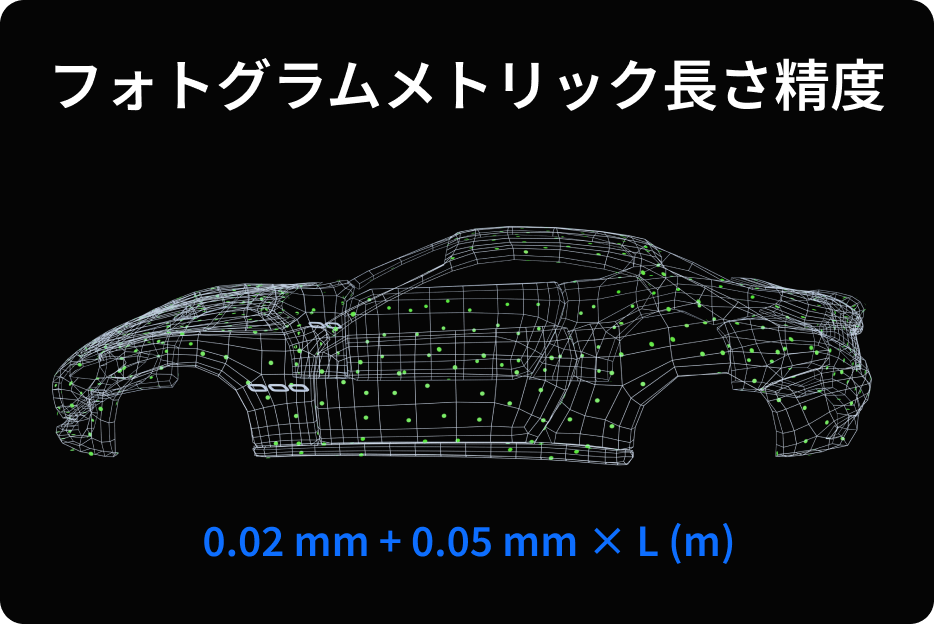 MIRACO Plusのフォトグラムメトリック機能を活用することで、自動車、船舶や航空機の部品、機械などの大型オブジェクトの計測グレード3Dモデルを作成できます。最大0.02 mm + 0.05 mm/mの優れた長さ測定精度を実現します。