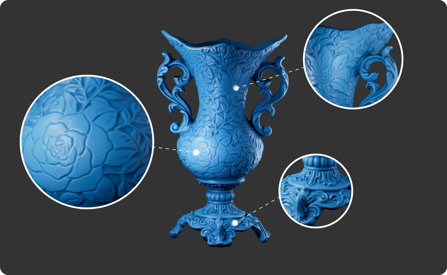 プロジェクターの光学1.5倍/2倍ズーム機能で、複合幾何学形状の表面もディテール取りこぼしなし。構造光を集中制御し、多曲面複雑物体の細部まで確実・容易に捕捉を実現。