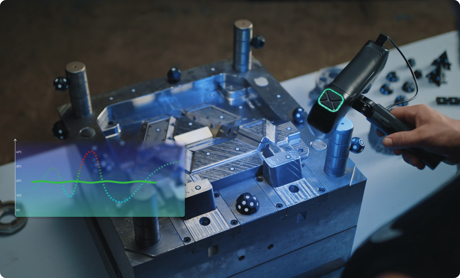 高精度な3Dスキャンを維持するため、MetroYシリーズには高感度の温度センサーを搭載。温度変動を監視し、スキャナーの温度をリアルタイムで表示します。これにより、最適な動作を確保し、温度変化に伴う精度の偏差を防ぎます。