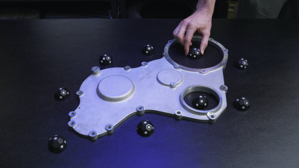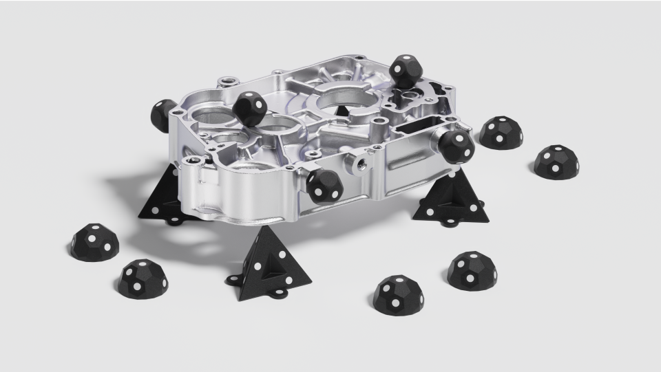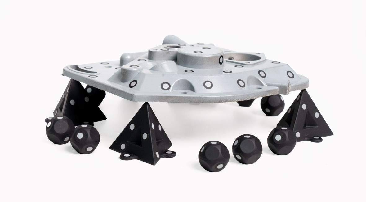 マーカーブロックキット*は、3Dスキャン中に異なる角度から複数の参照点を迅速に提供するために設計されたトラッキング補助ツールです。これらのマーカーは再利用可能で、さまざまなニーズに応じて簡単に組み合わせることができます。マーカーブロックキットは、特徴のないオブジェクトをスキャンする準備やMetroXのレーザーモードを使用する際のワークフローを大幅に効率化し、マーカーのトラッキングとアライメントの精度を向上させます。